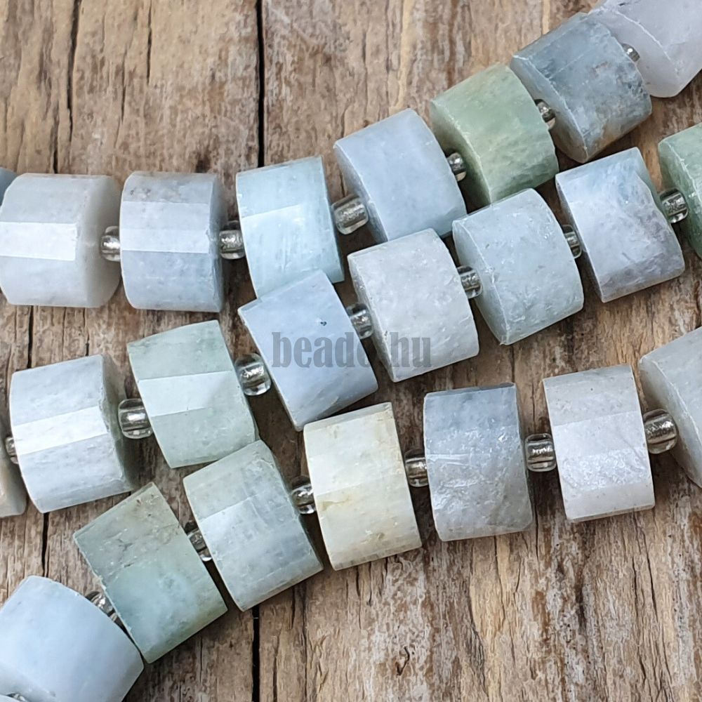 - Akvamarin gyöngyök 10x7 mm hengerek rokaival félhoszú zsinór