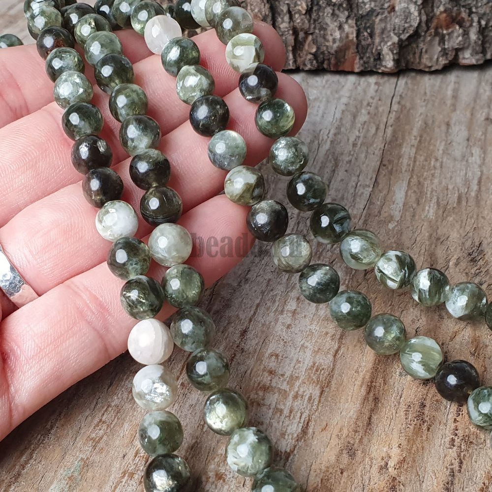 Lepidolit zöldes fehér gyöngyök 8 mm félhosszú zsinór