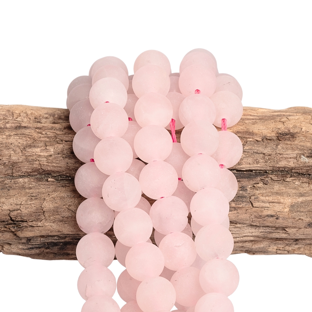 Viloágos rózsakvarcból készült, matt felületű gyöngyök inklúziókkal. Természetes „tökéletlenségeket” tartalmaznak, például apró repedéseket és alkalmanként sötétebb foltokat. Minden szál egyedi. A szállított darab színárnyalatban és a gyöngyök méretében enyhén eltérhet.