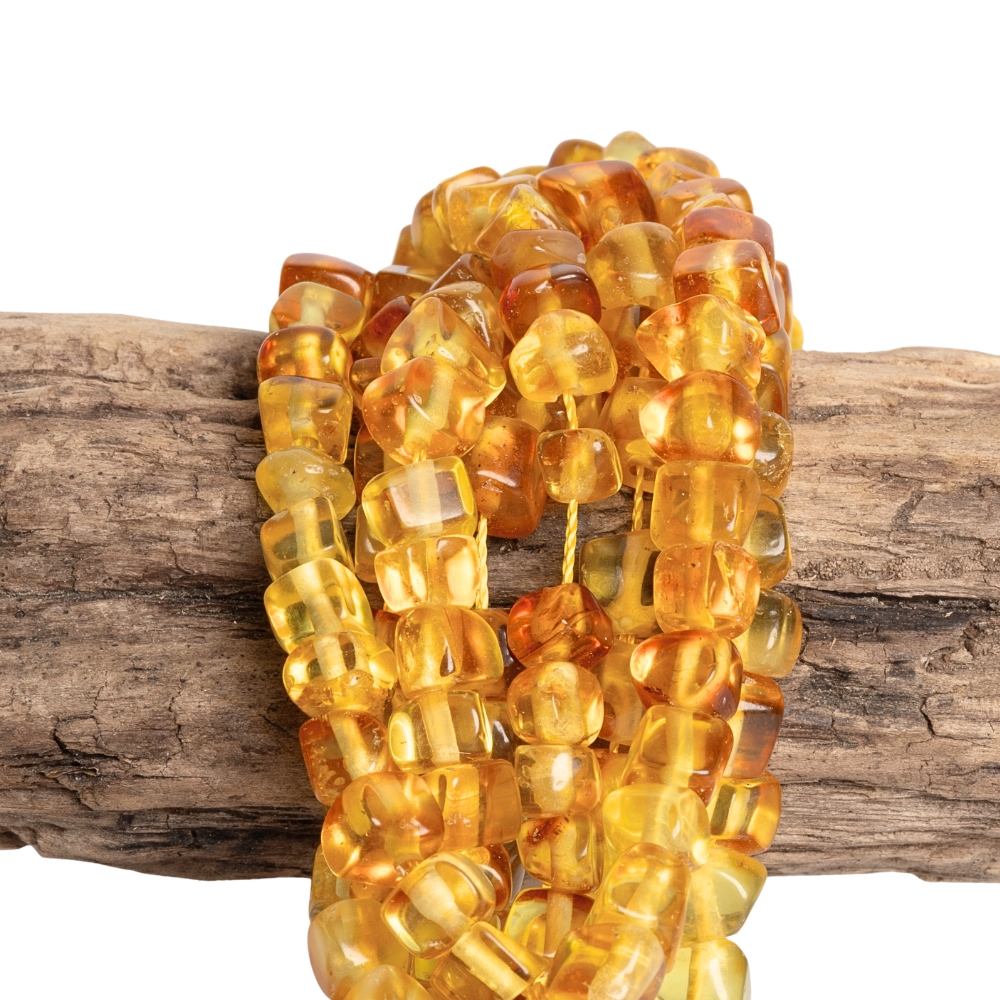 Sárga-narancs borostyán áttetsző gyöngyök 5–6 mm szabálytalan kockák, füzér