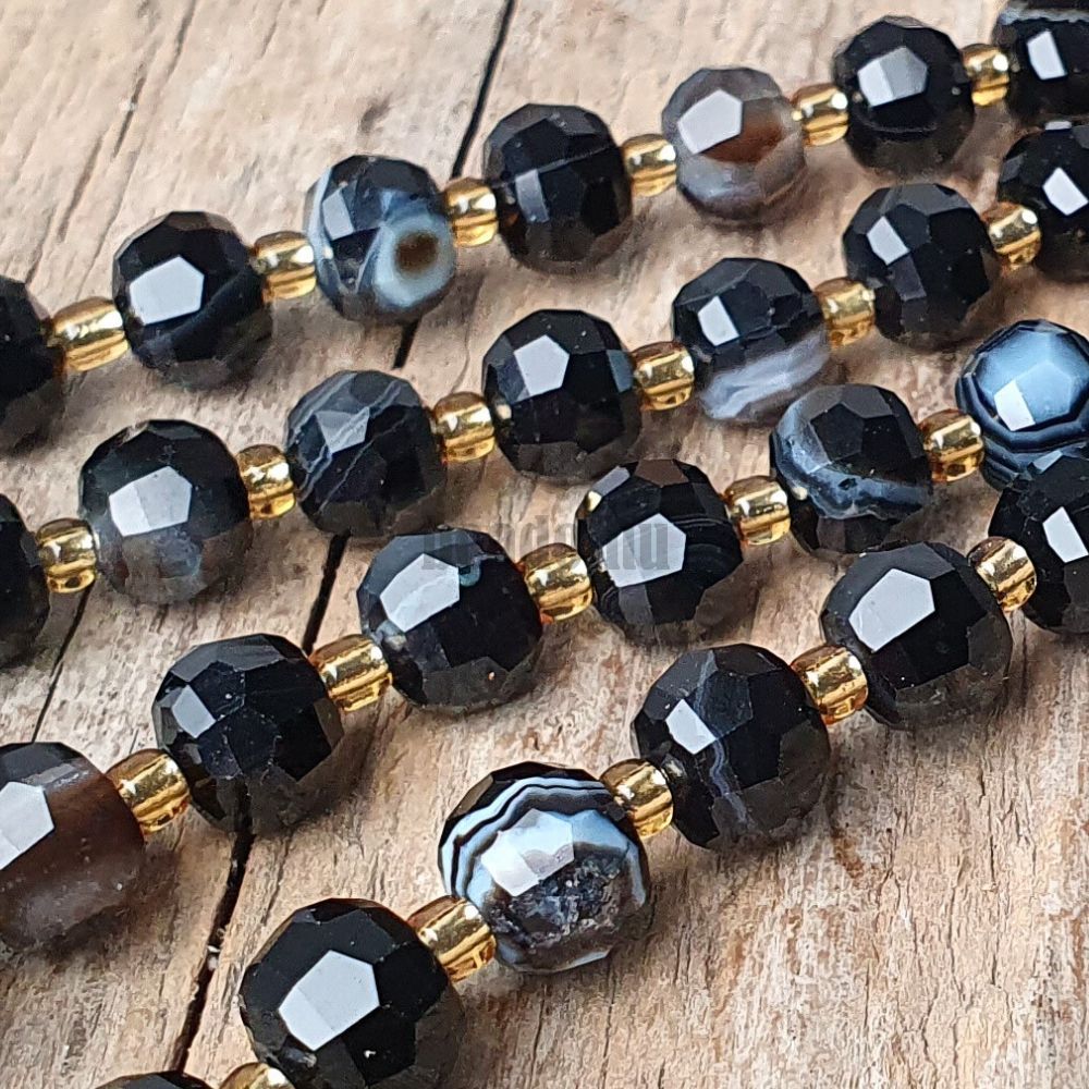 Szalagos achát fekete gyöngyök 6x8 mm rondell csiszolt félhosszú zsinór