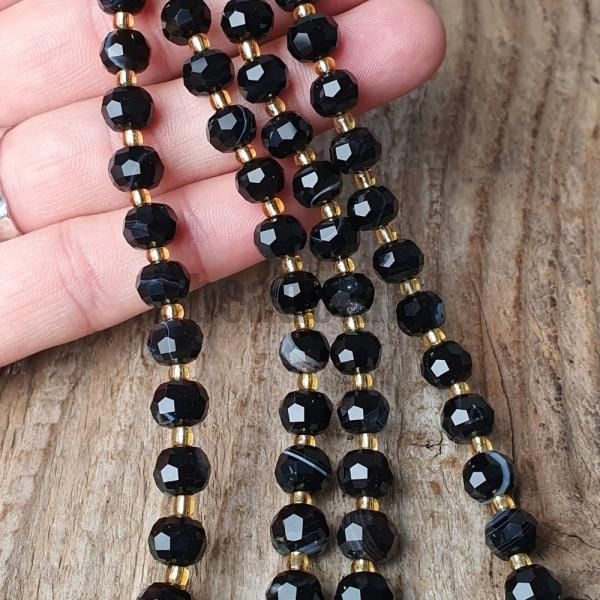 - Szalagos achát fekete gyöngyök 6x8 mm rondell csiszolt félhosszú zsinór