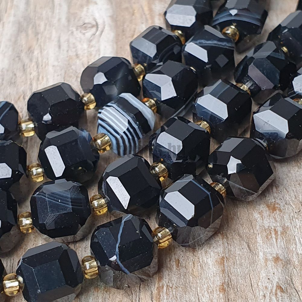 Szalagos achát fekete gyöngyök 8 mm kockák csiszolt félhosszú zsinór