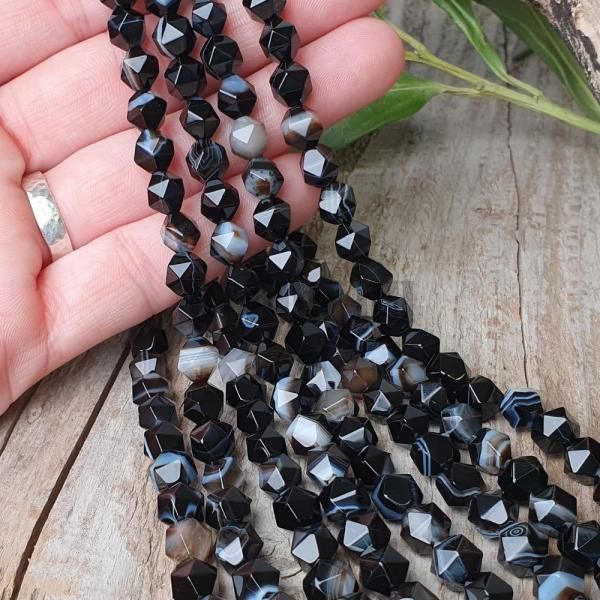 Szalagos achát gyöngyök 8 mm fekete bicone csiszolás zsinór