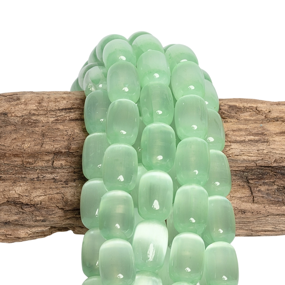 Világoszöld szelenit gyöngyök 8×12 mm hengerek félhosszú zsinór